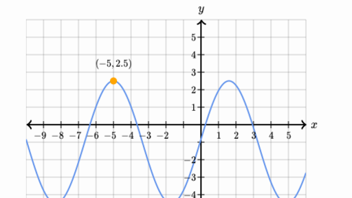 Questions on how to find the equation of a sinusoidal function given by its graph with its properties such as maximum and minimum values points a and b mark the start and the end of one period p which is equal to 5π.
